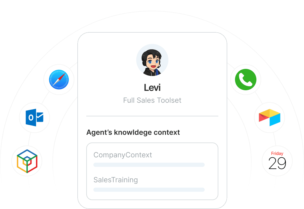 Levi integrates with over 1,000 platforms out of the box — from Google Calendar to CRMs and booking systems.